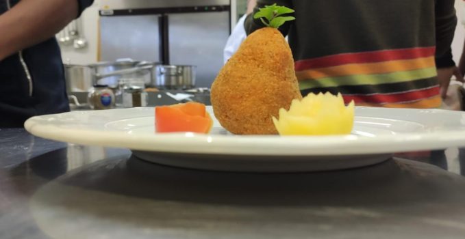 Immersi in una atmosfera di curiosità, sperimentazione e professionalità, invasi dall’odore di spezie e aromi orientali (curcuma, cannella e altri), misti alle erbe nostrane, alcune raccolte direttamente dall’orto della scuola, tra i fumi della cottura al vapore per la semola del cous cous lavorato a mano da tutti i ragazzi e un pentolone con lo spezzatino di agnello e un mix di ortaggi, un po’ per gioco, un po’ per caso, in mezzo a 15 cappelli da cuoco, prende vita “Cuscussina”, l’arancina di cous cous che stupisce chef e ragazzi.