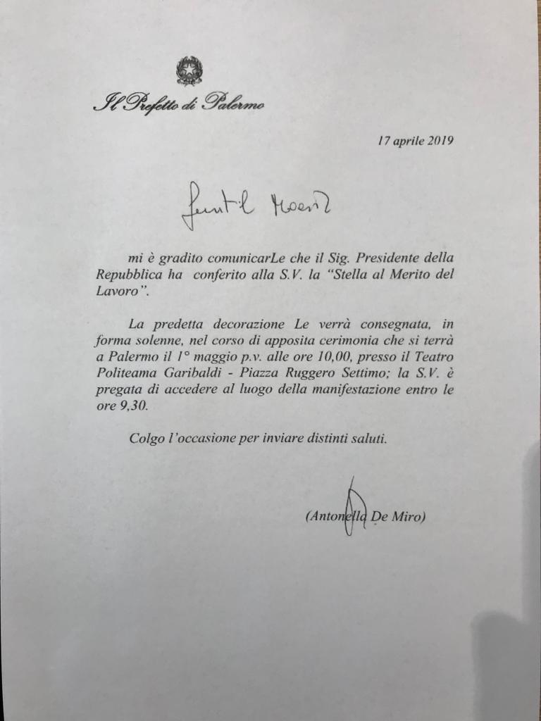 L’amico Angelo Chessari, ragusano doc, nel giorno di Festa del 1° Maggio scorso, è stato insignito della “Stella al Merito del Lavoro” conferita dal Presidente della Repubblica e consegnata dal Prefetto di Palermo dott.ssa Antonella de Miro, in una particolare cerimonia svoltasi, in forma solenne, presso il Teatro Politeama Garibaldi.