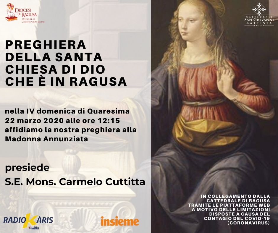 Anche domenica prossima, quarta domenica di Quaresima, la Diocesi di Ragusa si unirà in un mo-mento di preghiera guidato dal vescovo monsignor Carmelo Cuttitta. In collegamento attraverso le piattaforme web della Diocesi e della Cattedrale di San Giovanni Battista, alle 12.15, sarà possibile stringersi in preghiera, rafforzando il sentirsi e l’essere comunità pur nelle restrizioni che in questo momento ci impongono le normative sul contenimento della diffusione del virus Covid-19.