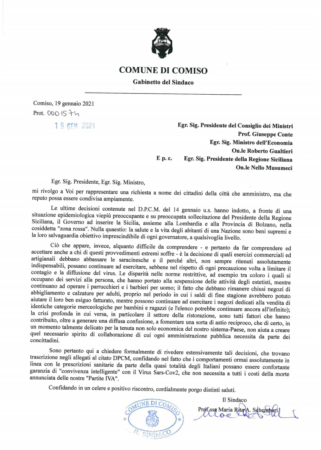 “Alle misure severe per contenere il contagio – dichiara Maria Rita Schembari-  nessuno oserebbe ribellarsi se in esse si leggessero linearità di intenti ed equità nei confronti di tutti. La confusione e le disparità invece generano invidie ed astio: quanto di meno auspicabile in questo momento! Per questo ho inviato oggi una richiesta al Presidente del Consiglio dei Ministri e al Ministro dell’Economia: non si può addossare la responsabilità del successo della zona rossa a pochissime categorie del commercio e dell’artigianato. Dobbiamo imparare a convivere a lungo con il virus – ancora il primo cittadino-  e non destinare alla morte i nostri piccoli imprenditori: recandoci ad acquistare abbigliamento o gioielli, o sottoponendoci alla cura della nostra persona osserveremo le regole con eguale scrupolo di quando compriamo scarpe per i nostri bambini o andiamo a farci accorciare i capelli”.
