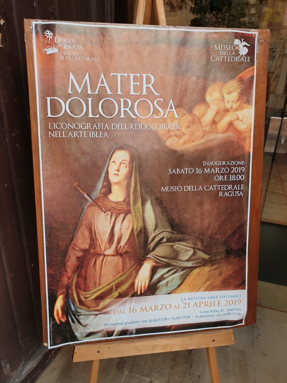 “Mater Dolorosa” è una selezione di dodici tele, del Settecento e dell’Ottocento, provenienti da tutta la Diocesi ragusana, in particolare Comiso, Monterosso Almo, Chiaramonte Gulfi e la stessa Ragusa, il cui soggetto principale è Maria, la Madre di Gesù, la cui devozione trae origine dal Vangelo, che attesta la presenza della Vergine sul Calvario durante il martirio di Cristo.