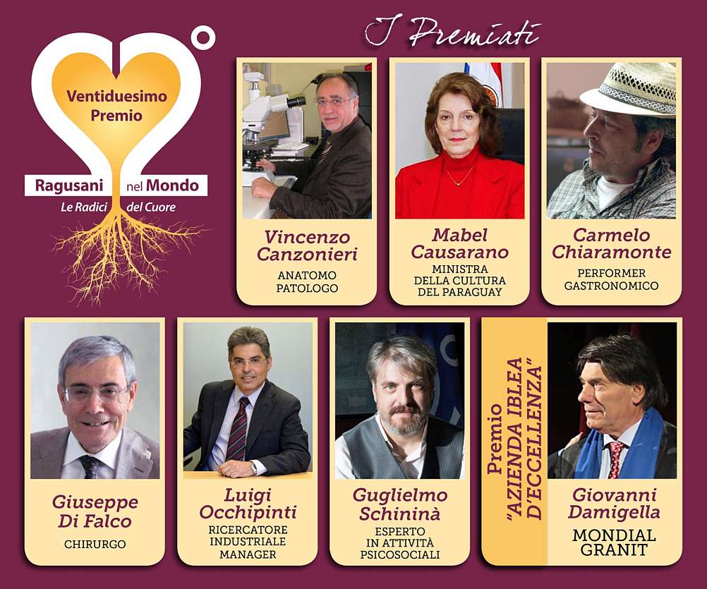 Ad essere premiati saranno l’anatomopatologo Vincenzo Canzonieri, originario di Comiso, a livello internazionale noto ricercatore medico nel campo dell’oncologia, e poi Giuseppe Di Falco, originario di Vittoria, fondatore della prima Banca Nazionale dei tessuti, pioniere in Italia della chirurgia esofagea e protagonista della chirurgia mini-invasiva e robotica. La tradizione culinaria della Sicilia esportata nel mondo è alla base dell’attività svolta dallo chef Carmelo Chiaramonte, cantore della cucina siciliana, originario di Modica. Sul palco anche Luigi Occhipinti, ricercatore industriale, progettista e manager a Cambridge, originario di Ragusa, e più volte responsabile scientifico di una dozzina di progetti di collaborazione internazionale finanziati dall’Ue. Ed è originario di Ragusa anche Guglielmo Schininà, esperto in attività psicosociali e responsabile dello Oim, l’organizzazione internazionale per le migrazioni. Ha lavorato in più di quaranta Paesi e attualmente lavora in Egitto. Infine una donna d’eccezione tra i premiati di questa edizione, ovvero Mabel Causarano, ministra della Cultura del Paraguay, nata ad Asuncion, ma la sua famiglia era originaria di Scicli.