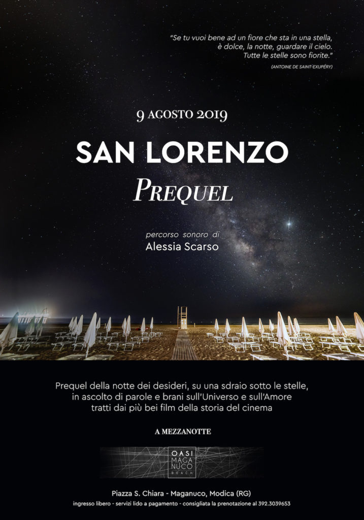 Modica – Nel cinema il Prequel è quel racconto il cui contenuto narra gli antefatti di una storia. “San Lorenzo. Prequel” è il titolo del percorso sonoro e musicale ideato dalla regista Alessia Scarso. Il 9 agosto, nella notte antecedente la famosa notte dei desideri di San Lorenzo, la regista modicana nota per il suo film Italo e annoverata tra gli astrofotografi più notevoli al mondo nel concorso fotografico Astronomy Photographer of the Year di Londra, propone un percorso sonoro e musicale da godersi su una sdraio sotto le stelle. Da Apollo 13 a Blade Runner, da C’era una volta in America a Mary Poppins, da Il Postino a Jules e Jim, nel buio della spiaggia, al lume di candela, in ascolto di brani sull’Universo e sull’Amore tratti dai più significativi film della storia del Cinema.